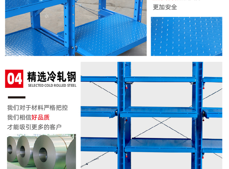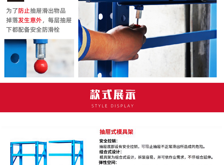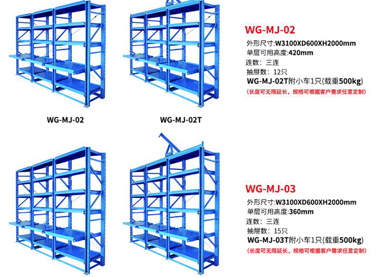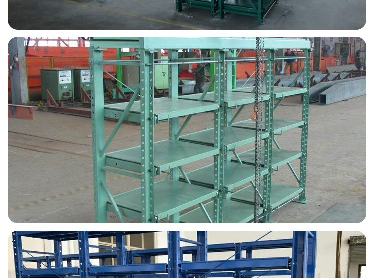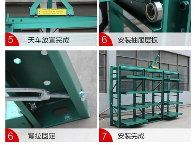 Drawer type shelves are usually used to store heavy objects such as molds, without the need for forklifts. The top can be equipped with a mobile hoist truck (hand pulled or electric) to achieve mold lifting. The bottom of the drawer board is equipped with roller tracks, which can still be freely pulled after being carried by the drawer board, and an additional positioning safety device is added. The roller track is integrally formed with molds, with extremely high precision and assembly accuracy, so the service life of the roller is greatly extended and it is easy to pull out or push in during use. The shelf height is generally below 2.5m, and can be designed and made into a drawer type structure except for the top layer. It can easily extract heavy objects up to 1000kg per layer, supplemented by cranes or hoists, to easily achieve the storage and retrieval of goods.