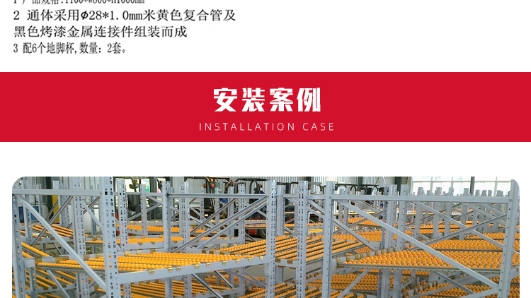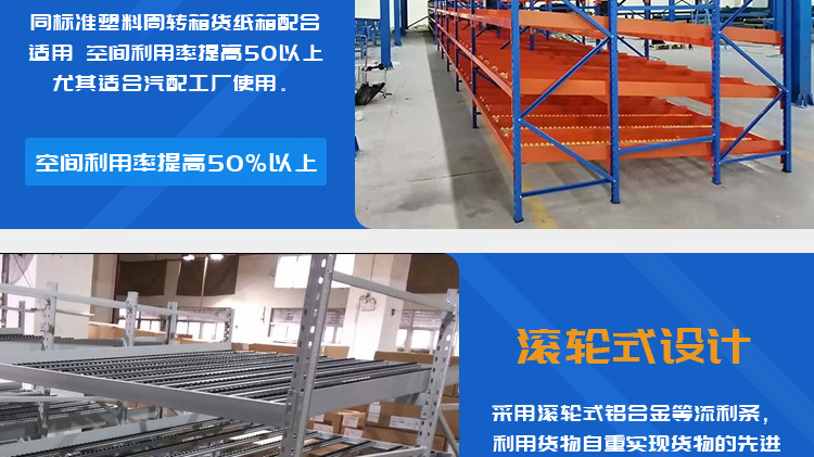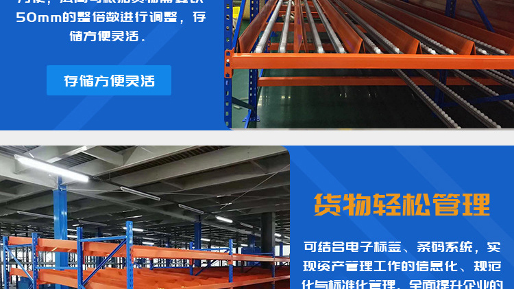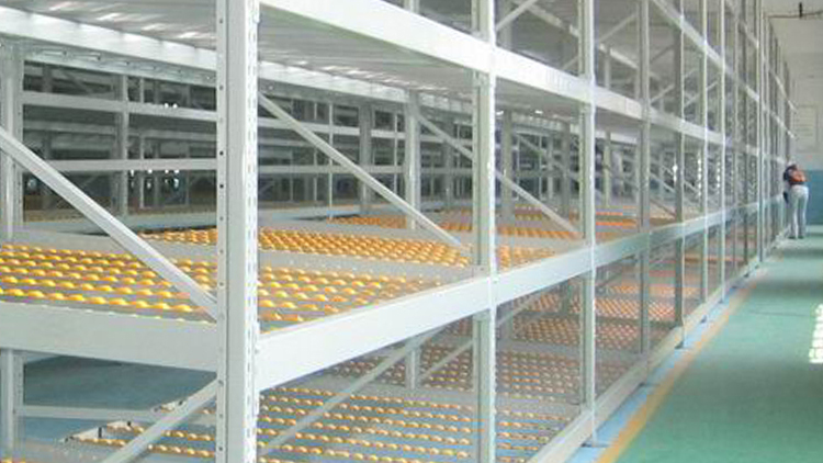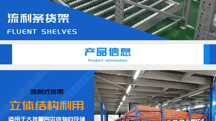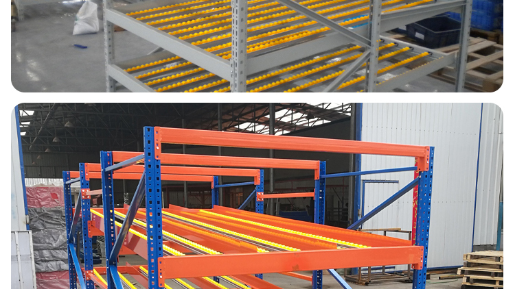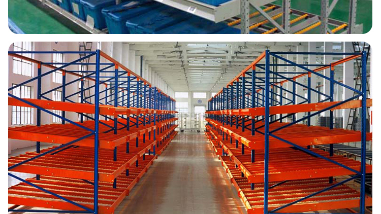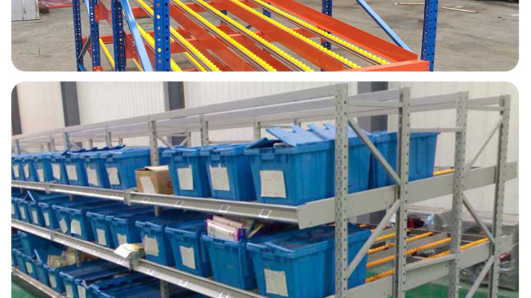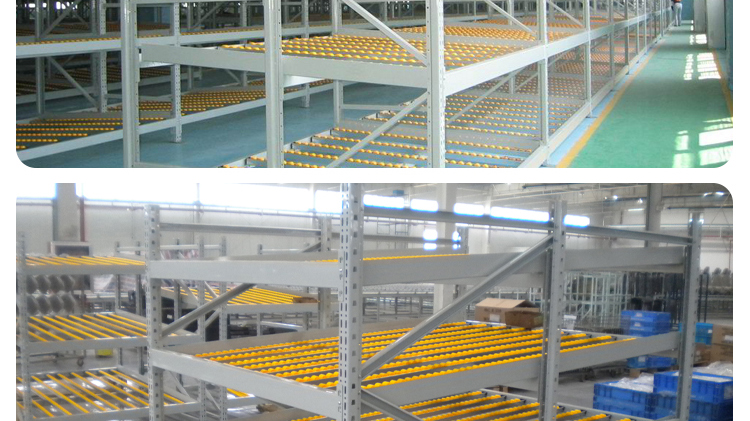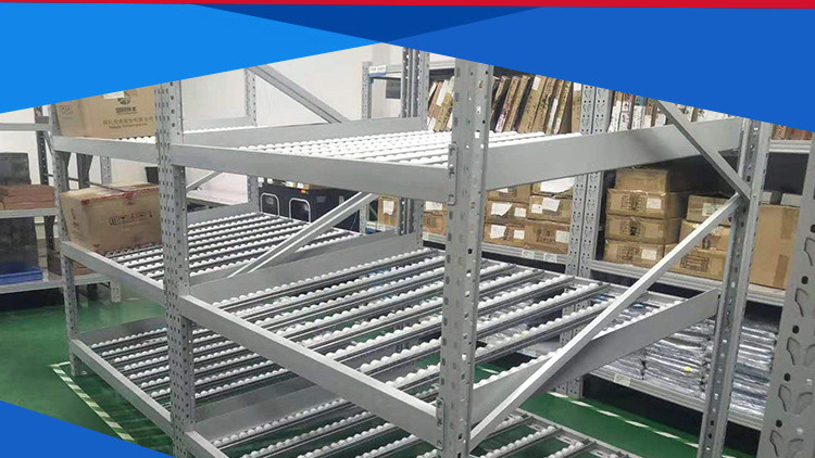 The fluency bar of the fluent shelf is directly connected to the front and rear crossbeams and the middle support beam, and the crossbeam is directly hung on the pillar. The installation inclination of the fluency bar depends on the size, weight, and depth of the cargo box, usually ranging from 5% to 9%. The carrying capacity of the fluent roller is 6kg/piece. When the goods are heavy, 3-4 fluent rollers can be installed on one roller track. Usually, a support beam is installed every 0.6m in the depth direction to increase the stiffness of the flow bar. When the raceway is long, a partition board can be used to separate the raceway. The pickup end needs to install brake pads to slow down the cargo and reduce impact.