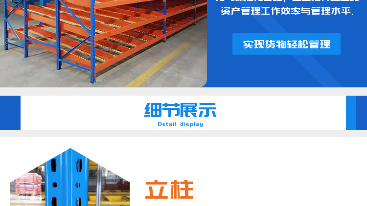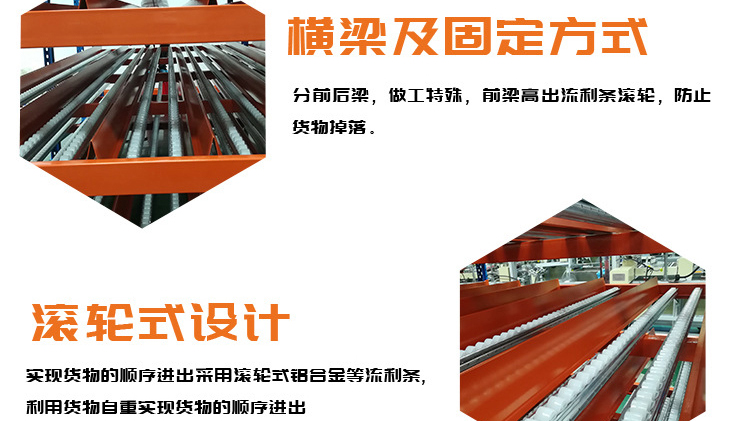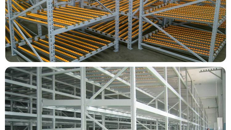 The fluency bar of the fluent shelf is directly connected to the front and rear crossbeams and the middle support beam, and the crossbeam is directly hung on the pillar. The installation inclination of the fluency bar depends on the size, weight, and depth of the cargo box, usually ranging from 5% to 9%. The carrying capacity of the fluent roller is 6kg/piece. When the goods are heavy, 3-4 fluent rollers can be installed on one roller track. Usually, a support beam is installed every 0.6m in the depth direction to increase the stiffness of the flow bar. When the raceway is long, a partition board can be used to separate the raceway. The pickup end needs to install brake pads to slow down the cargo and reduce impact.
